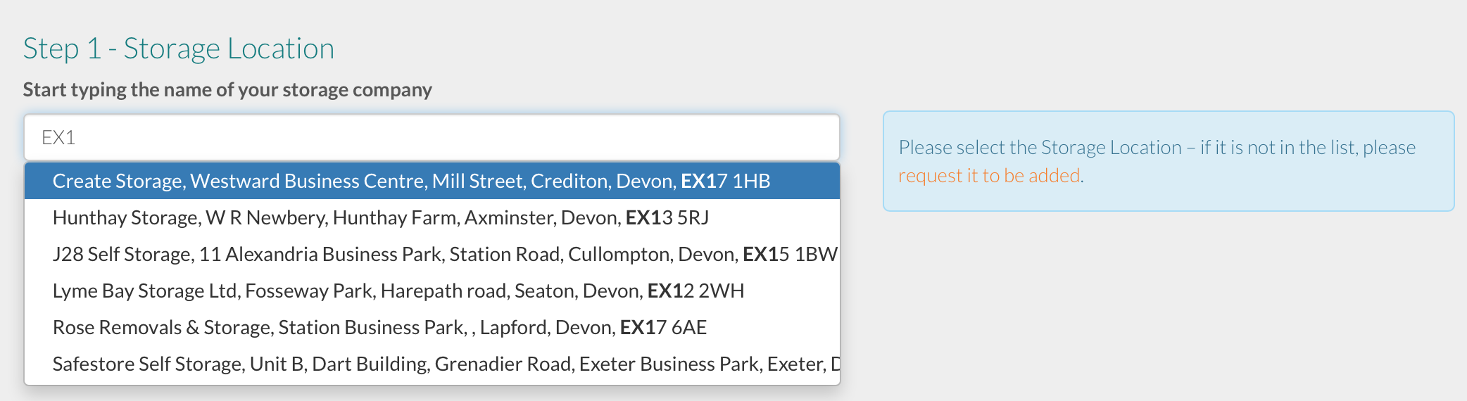 We find it is often easier to search by postcode initially (storage names do not always give an accurate result).If you add the postcode of the storage facility you should find that any matching locations we already have in our storage location database will be listed and you can select your location.